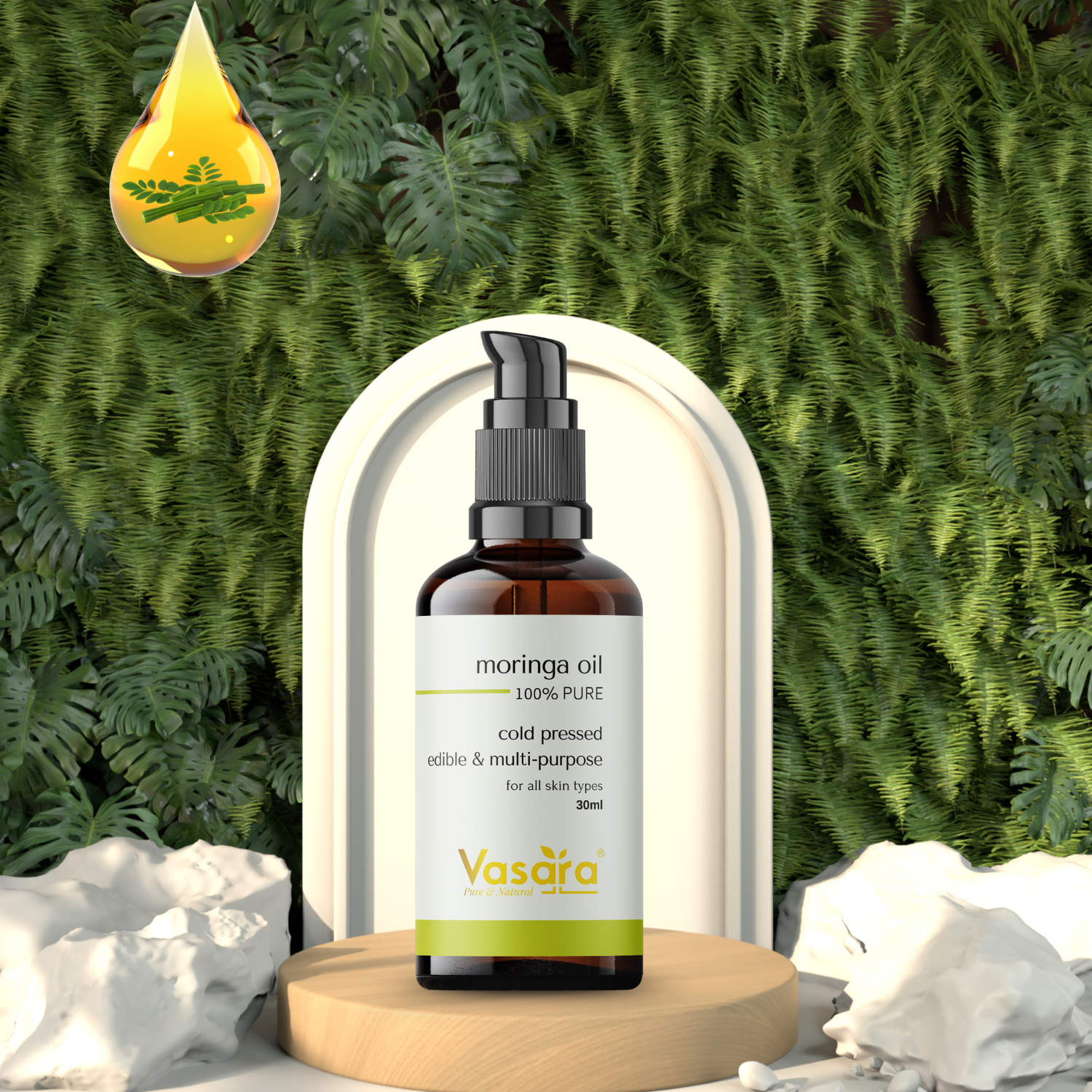 Vasara Cold Pressed Moringa Oil is 100% pure, unrefined, and extracted from high-quality Moringa oleifera seedsusing traditional cold press methods in wooden kolhus. This slow and heat-free extraction retains the oil’s powerful nutrient profile — including vitamin E, oleic acid, behenic acid, plant sterols, and antioxidants.Often called the “miracle oil,” moringa oil has been used for centuries in Ayurveda for its deeply nourishing, rejuvenating, and healing properties. Ideal for topical and wellness use, it restores skin vitality, strengthens hair, soothes inflammation, and supports holistic beauty from the inside out.